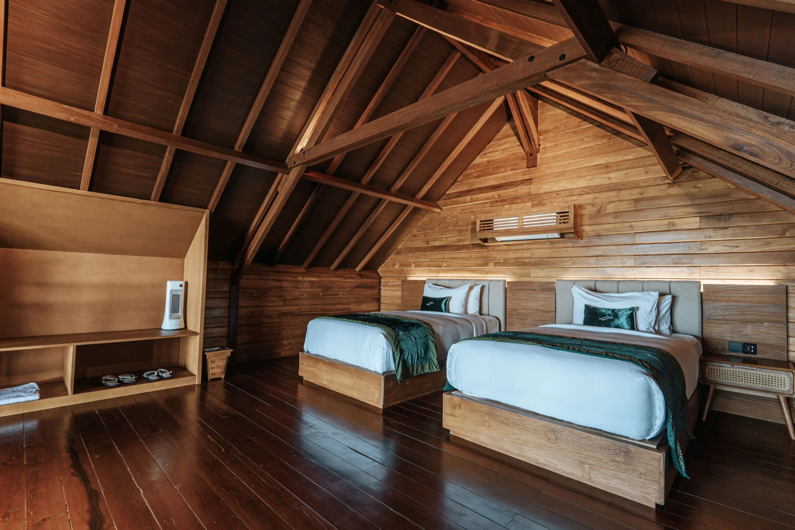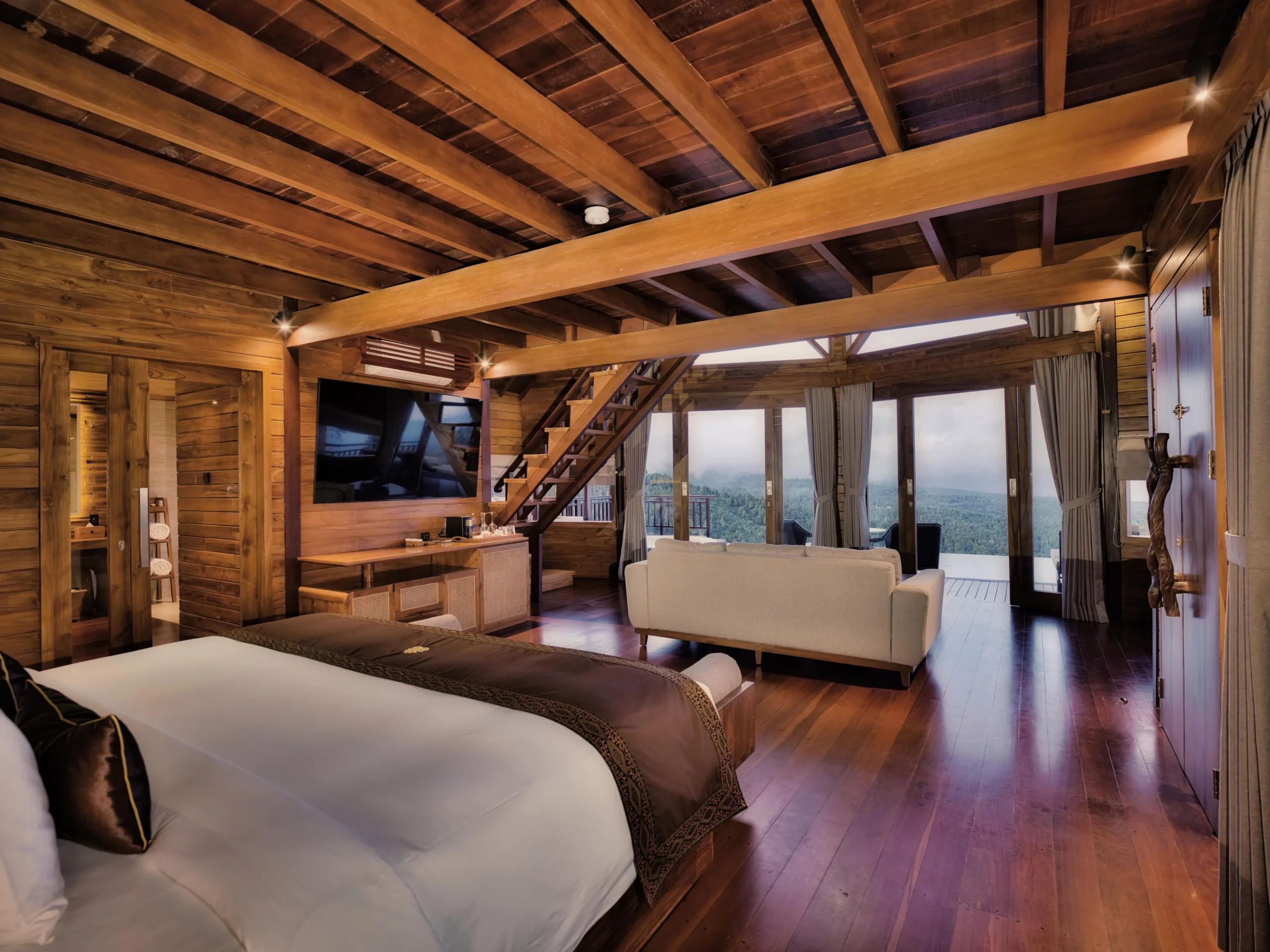Step into the ensuite bathroom, where luxury awaits with a rain shower and a specially designed terrazzo bathtub, alongside fully equipped luxury amenities. Designed in contemporary Balinese style, the roomy bedrooms boast a King bed on the lower level and twin beds on the upper level, adorned with locally-spun silks and natural cottons for a perfect blend of style and comfort.